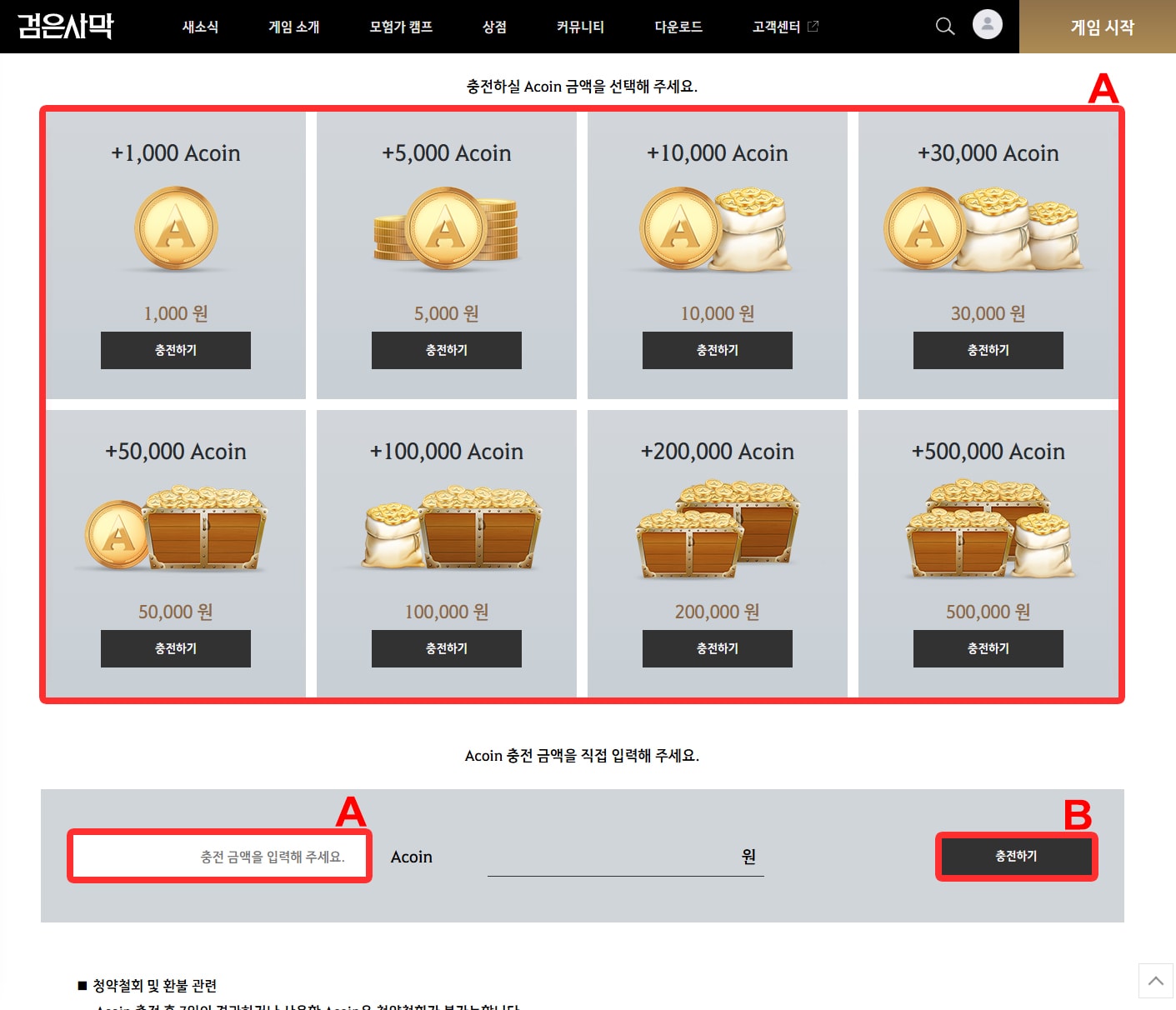 2. Click or Enter the Top-Up credit amount (A) you purchased in your order, Click Charge (충전하기) (B).