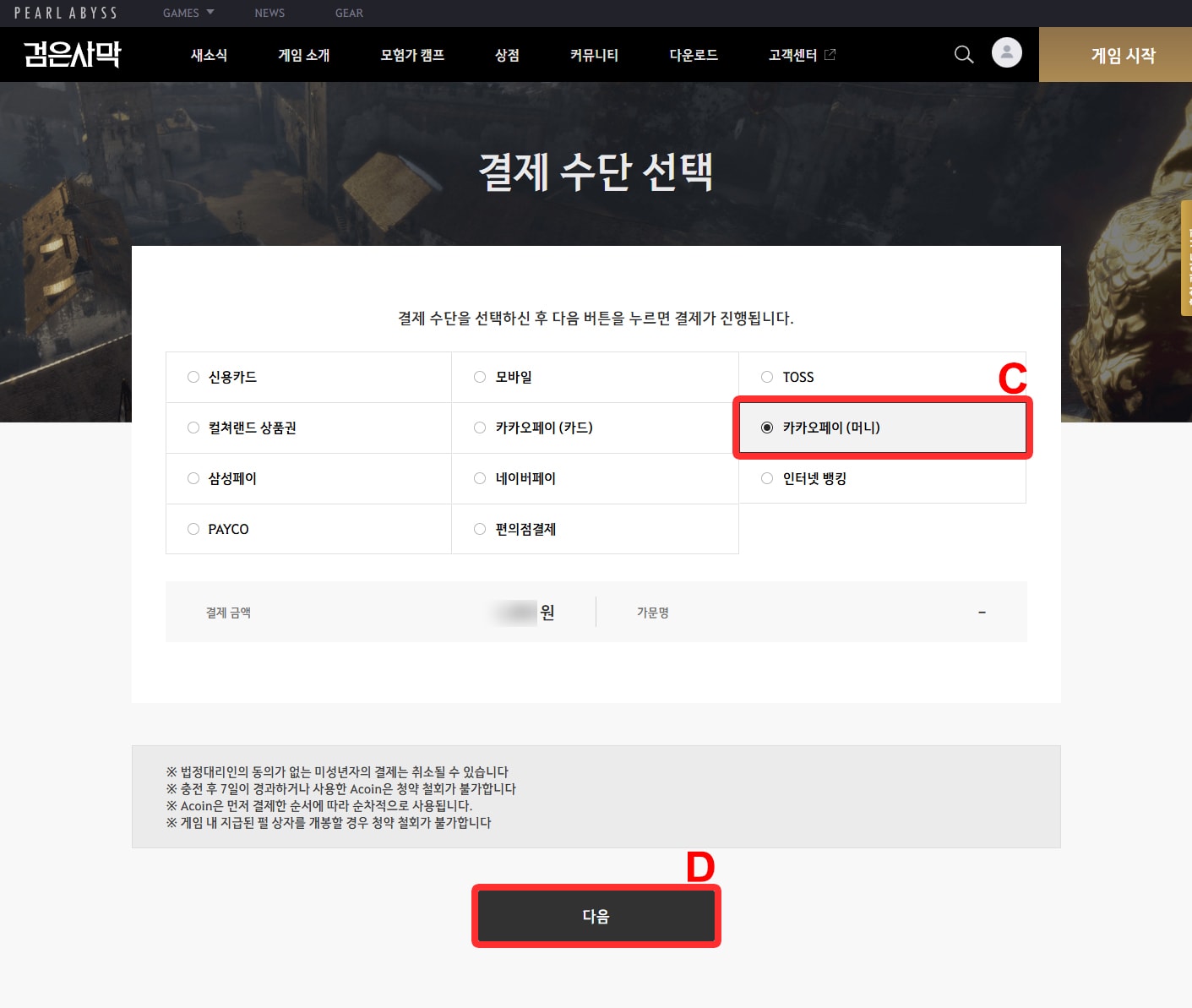 3. Then Select KakaoPay (카카오페이 (머니)) (C) Click Next (다음) (D).