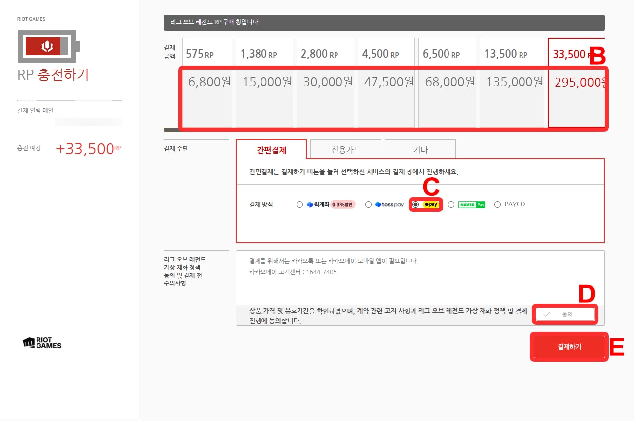 3. Click the Top-Up credit amount (B) you purchased in your order, Select KakaoPay (C), Click agree (동의) (D) then Click Pay (결제하기) (E)
